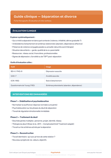 Fiche thérapeute sur l'évaluation clinique et les interventions recommandées en 3 phases pour l'accompagnement psychologique des adultes traversant une séparation ou un divorce.