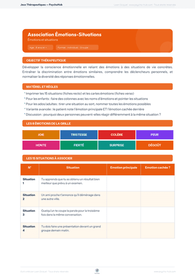Jeu thérapeutique de discrimination émotionnelle associant 15 situations de vie à 8 émotions de base, avec identification de l'émotion principale et de l'émotion cachée derrière, pour développer la conscience émotionnelle.