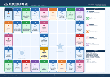 Jeu de plateau thérapeutique de 30 cases (questions, défis, émotions, cases oie) pour renforcer l'estime de soi chez les enfants et adolescents, favorisant la réflexion sur les qualités, réussites et émotions positives.