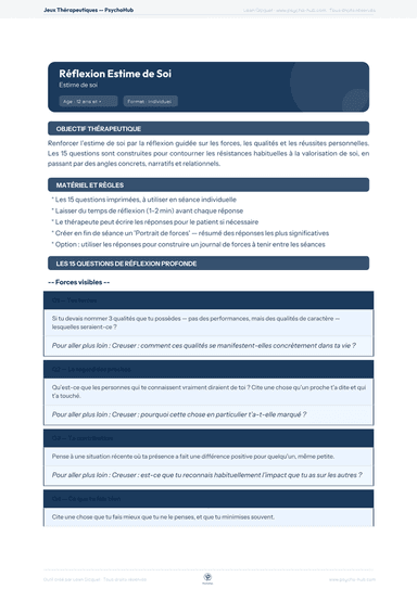 Protocole de 15 questions de réflexion guidée organisées en 3 thèmes (forces visibles, qualités profondes, réussites) pour renforcer l'estime de soi en contournant les résistances habituelles à la valorisation de soi.