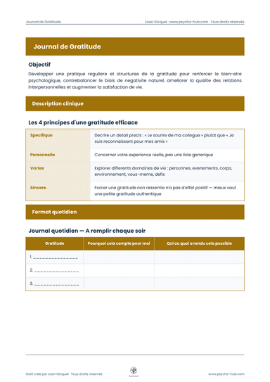 Protocole structuré de journal de gratitude avec format quotidien (3 items spécifiques + pourquoi + qui/quoi) et hebdomadaire, incluant des variantes avancées (lettre de gratitude, visite de gratitude, gratitude pour soi) et un suivi sur 4 semaines.