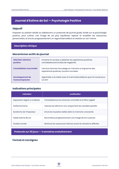 Protocole de journal guidé en 4 semaines progressives (réussites, qualités, moments de fierté, lettre à soi) fondé sur la psychologie positive pour cultiver une image de soi équilibrée et renforcer les ressources personnelles.
