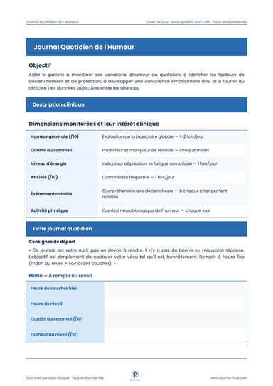 Protocole de monitoring quotidien de l'humeur avec relevé matin (sommeil, humeur, énergie) et soir (humeur min/max/moyenne, anxiété, activité physique, contact social), pour fournir des données objectives entre les séances et identifier les déclencheurs.