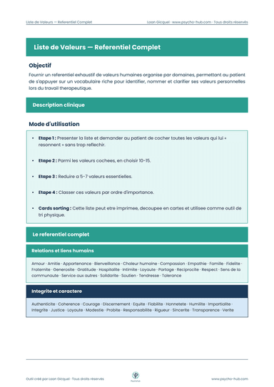 Référentiel exhaustif de valeurs humaines organisé en 8 domaines de vie, avec un protocole de clarification des valeurs en 4 étapes (présélection, réduction, priorisation, test de cohérence) et un exercice sur les valeurs en conflit, fondement du travail d'engagement en ACT.