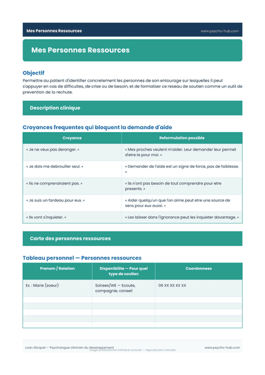 Outil structuré en 5 étapes pour cartographier le réseau de soutien du patient (personnes ressources et ressources professionnelles), identifier les obstacles à la demande d'aide et pratiquer l'assertivité de soutien dans le cadre de la prévention de la rechute.