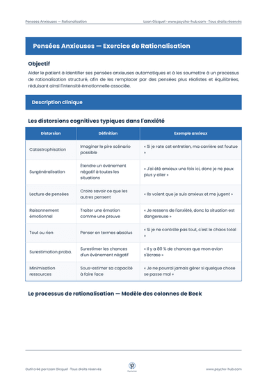 Exercice structuré en 7 colonnes selon le modèle de Beck pour identifier les pensées anxieuses automatiques, repérer les distorsions cognitives et formuler des pensées alternatives réalistes, afin de réduire l'intensité émotionnelle de l'anxiété.