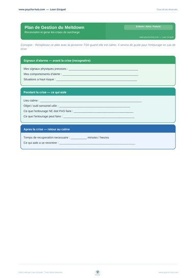 Plan de crise personnalisé destiné aux personnes TSA (enfants, adolescents) et à leur entourage, permettant d'identifier les signaux d'alarme précoces, les stratégies d'apaisement sensoriel et les conduites à tenir pendant et après une crise de surcharge.