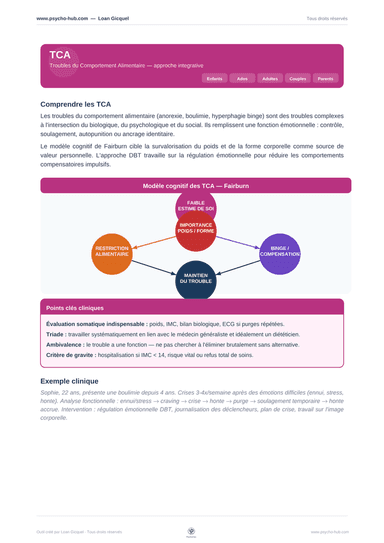 Fiche clinique de référence sur les TCA (anorexie, boulimie, hyperphagie) : modèle cognitif de Fairburn, approche DBT, points clés d'évaluation et de prise en charge, avec exemple clinique détaillé.