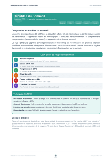 Fiche clinique de référence sur l'insomnie chronique : modèle de maintien, présentation de la TCC-I (restriction du sommeil, contrôle du stimulus, hygiène), avec les 6 piliers pratiques et un exemple clinique.