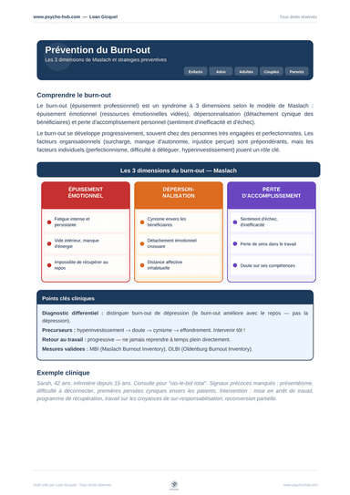 Fiche clinique de référence sur le burn-out professionnel : modèle tridimensionnel de Maslach (épuisement émotionnel, dépersonnalisation, perte d'accomplissement), diagnostic différentiel avec la dépression, et stratégies d'intervention.