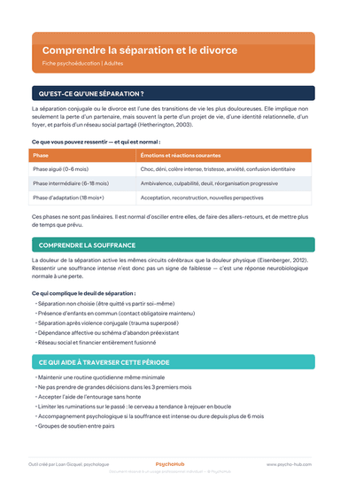 Fiche psychoéducative sur les phases émotionnelles de la séparation conjugale, les mécanismes neurobiologiques de la souffrance relationnelle et les stratégies d'adaptation validées.