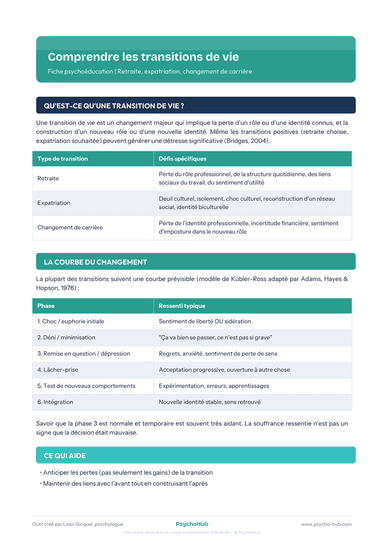 Fiche psychoéducative sur les grandes transitions de vie (retraite, expatriation, changement de carrière) : courbe du changement, défis spécifiques et stratégies d'adaptation.