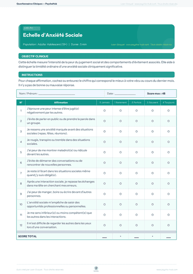 Questionnaire clinique de repérage de l'anxiété sociale en 12 items (score 0-48), distinguant la timidité ordinaire d'une phobie sociale cliniquement significative. Population adulte et adolescent 13+.