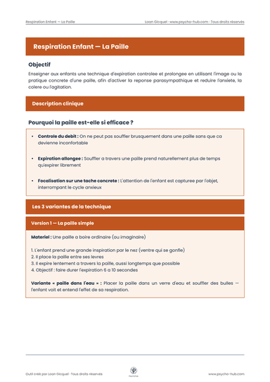Technique de régulation émotionnelle pour enfants de 4-12 ans utilisant une paille réelle ou imaginaire pour allonger l'expiration et activer la réponse parasympathique, avec 3 variantes ludiques.
