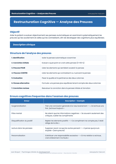 Outil de restructuration cognitive par analyse systématique des preuves soutenant et contredisant une pensée automatique, avec tableau structuré, erreurs cognitives fréquentes et exemple clinique complet.