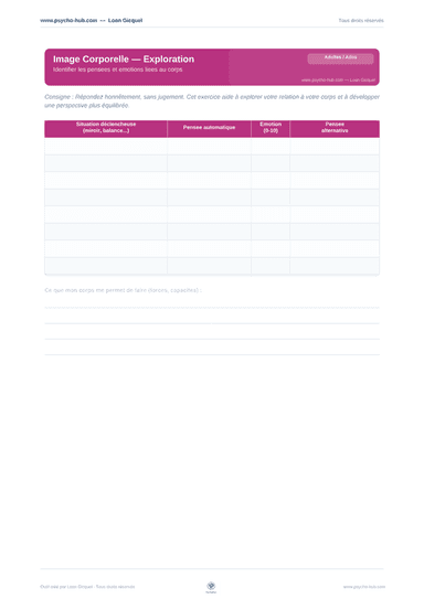 Outil de restructuration cognitive ciblant les pensées négatives automatiques sur soi-même, avec analyse colonne par colonne (preuves pour/contre) pour développer une pensée alternative plus juste et équilibrée.