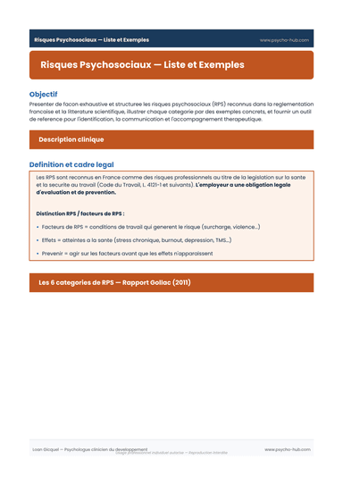 Présente de façon exhaustive et structurée les 6 catégories de risques psychosociaux (RPS) reconnus en France, illustrés par des exemples concrets, pour l'identification et l'accompagnement thérapeutique.