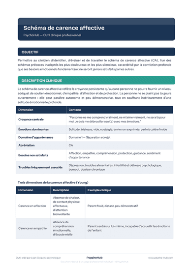 Outil clinique pour identifier et travailler le schéma de carence affective (CA), caractérisé par la conviction que ses besoins émotionnels fondamentaux — affection, empathie, protection — ne seront jamais satisfaits par les autres, souvent masqué par une apparente autonomie.
