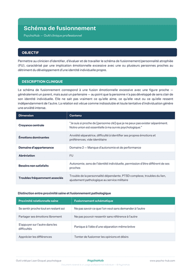 Outil clinique pour identifier et travailler le schéma de fusionnement/personnalité atrophiée (FU), caractérisé par une implication émotionnelle excessive avec une figure proche empêchant le développement d'une identité individuelle propre.