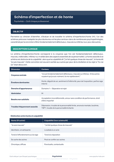 Outil clinique pour identifier et travailler le schéma d'imperfection/honte (IH), l'un des schémas les plus douloureux, caractérisé par la conviction d'être fondamentalement défectueux — avec protocole incluant la distinction honte/culpabilité, imagerie rescriptée et auto-compassion.
