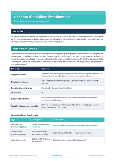 Outil clinique pour identifier et travailler le schéma d'inhibition émotionnelle (IE), caractérisé par la répression excessive des émotions et des comportements spontanés — lié à l'alexithymie, aux troubles psychosomatiques et à la dissociation.