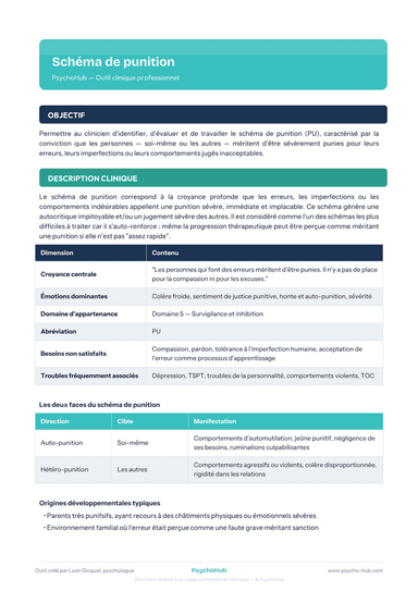 Outil clinique pour identifier et travailler le schéma de punition (PU), caractérisé par la conviction que les erreurs méritent une punition sévère et implacable — sous ses deux formes auto-punition et hétéro-punition — l'un des schémas les plus prédicteurs de comportements violents.