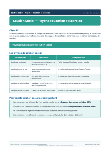 Aider le patient à comprendre le rôle protecteur du soutien social sur la santé mentale, à identifier ses ressources relationnelles et à développer des stratégies concrètes pour renforcer son réseau de soutien.