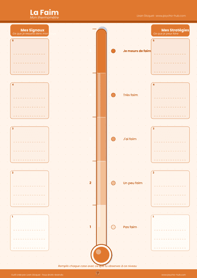 Apprendre à identifier et graduer les sensations de faim corporelle sur une échelle de 1 (pas faim) à 5 (je meurs de faim), pour développer l'écoute des signaux de faim et satiété dans le cadre d'un travail sur l'alimentation.