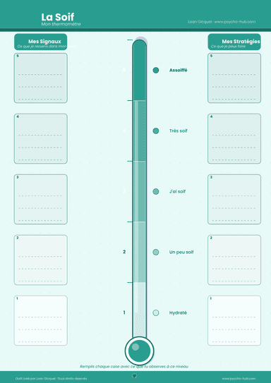 Apprendre à identifier et graduer les sensations de soif sur une échelle de 1 (hydraté) à 5 (assoiffé) pour développer la conscience intéroceptive des besoins hydriques.