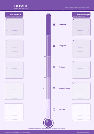 Identifier et graduer les niveaux de peur de 1 (pas peur) à 5 (terrorisé), associer des signaux corporels et des stratégies de régulation à chaque niveau pour préparer le travail d'exposition graduée.